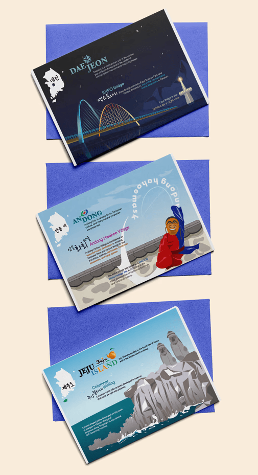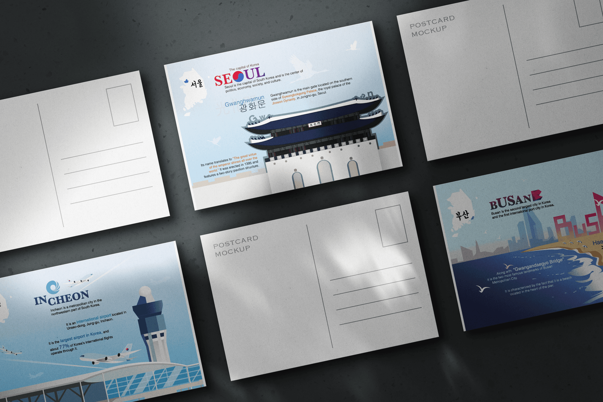 The assigned task was to create a set of postcards that interpret visual concepts. The design solution aimed to represent the characteristics of the 11 cities in South Korea by integrating enhanced type symbols and graphic illustrations for visual expression.