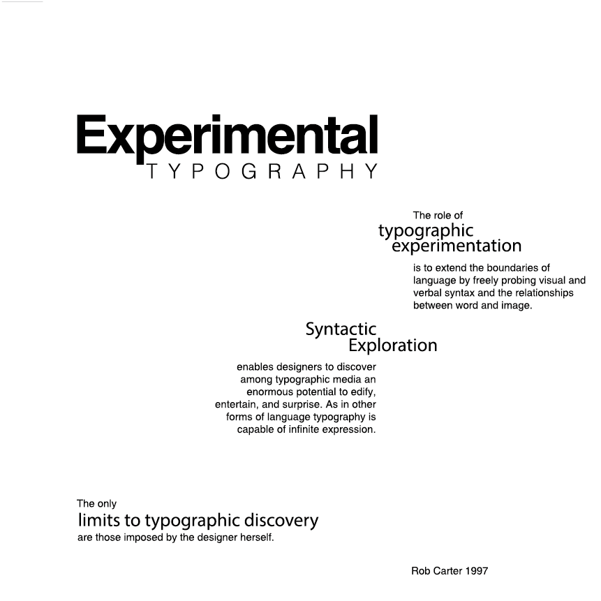 The experiment focuses on developing adequate visual literacy based on the given guidelines: A) using a single font, weight, and size in black and white. B) applying color and visual punctuation from example A. C) using a single font, different weights and sizes, with only black and white. D) applying color and visual punctuation from example C. The successful goal of the design solution is expected to demonstrate the roles and functions of type as symbol, image, and language in an effective visual hierarchy.