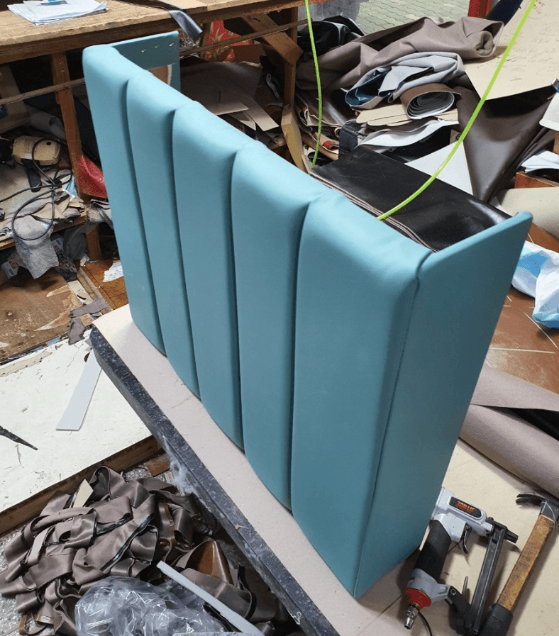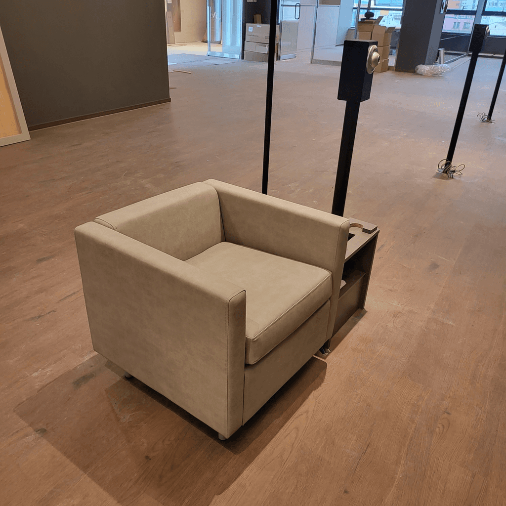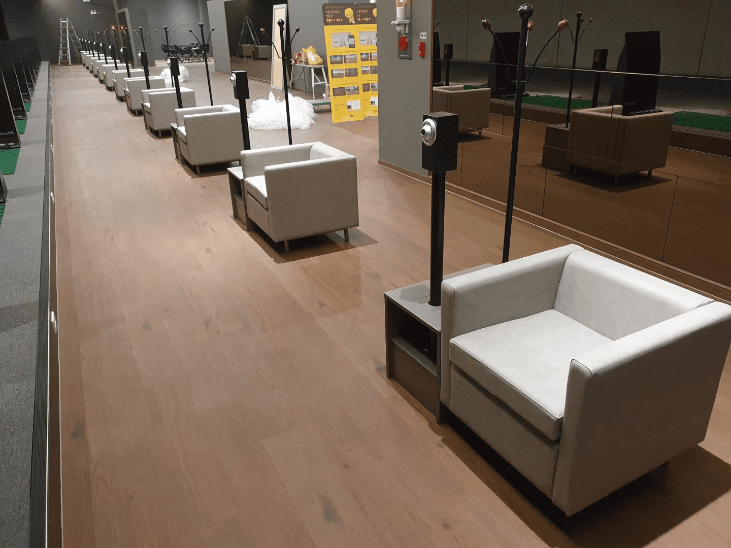 Couches and side-tables for a golf club. The side-tables were custom-made to allow for the installation of a screen golf camera and a coat rack.