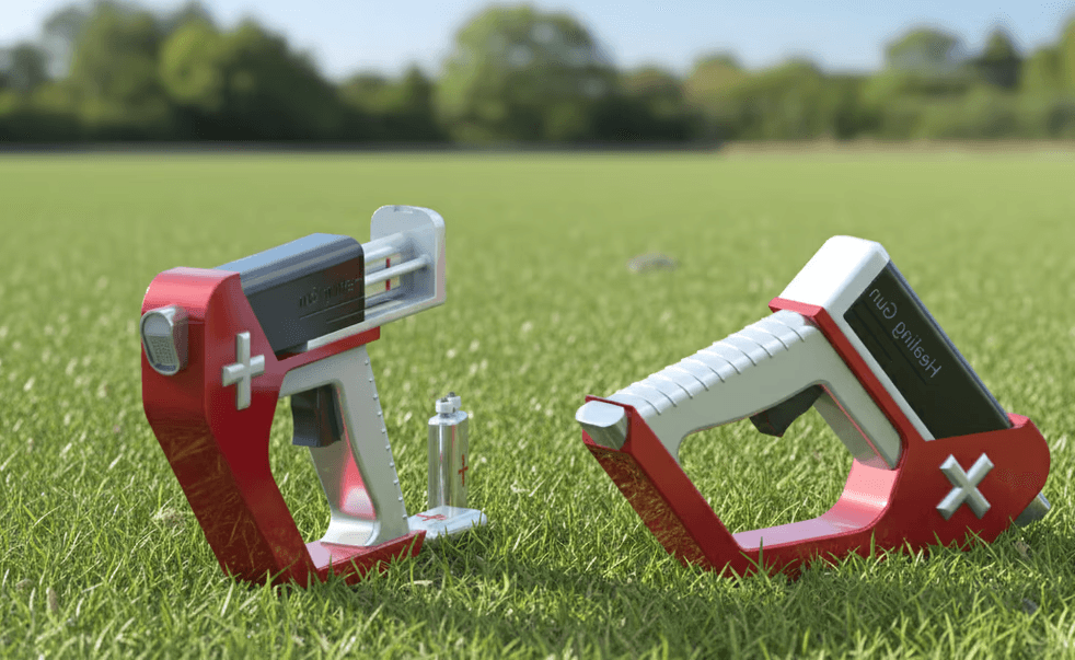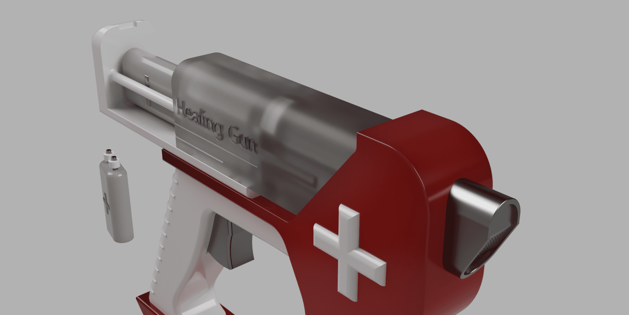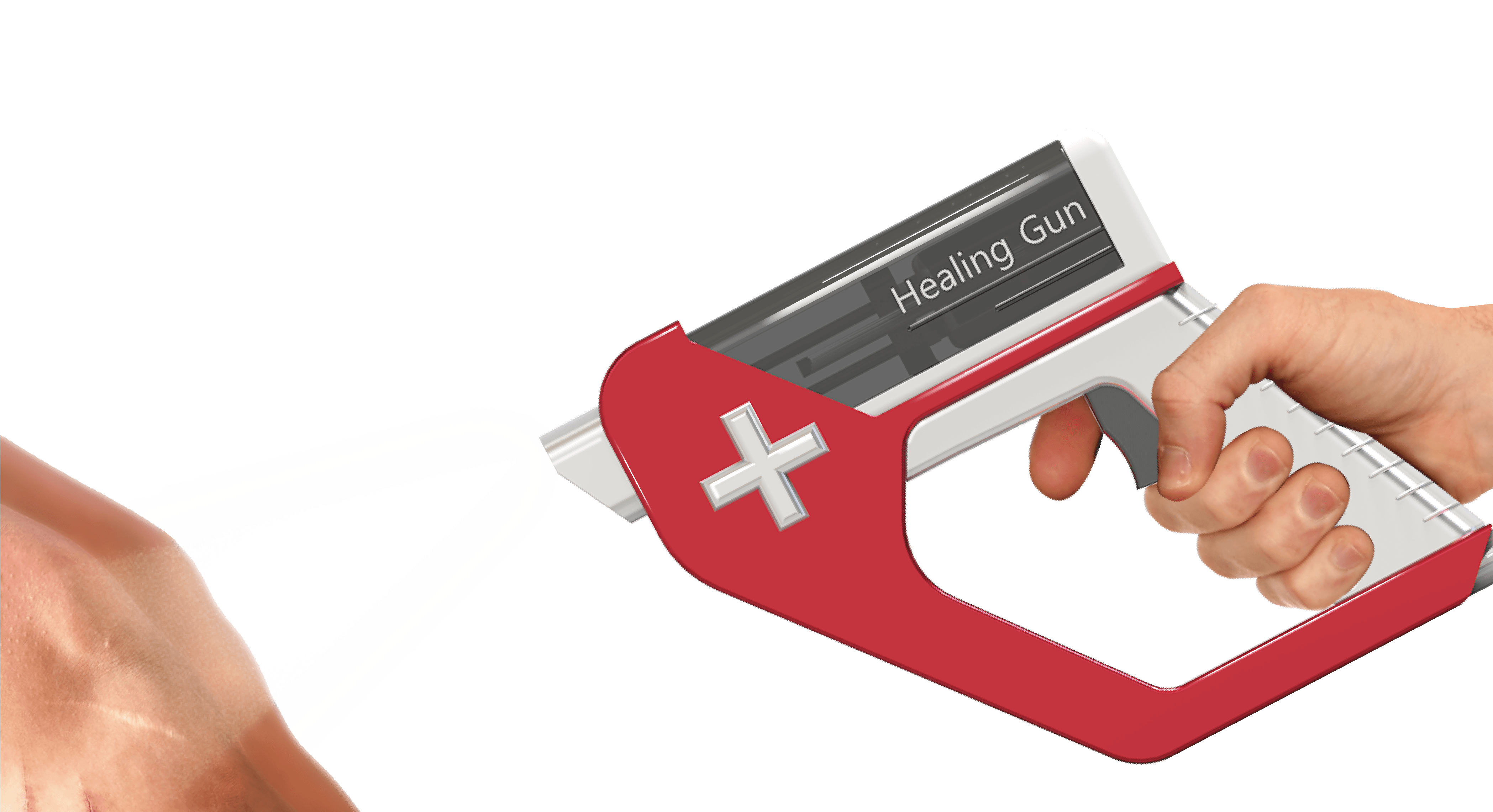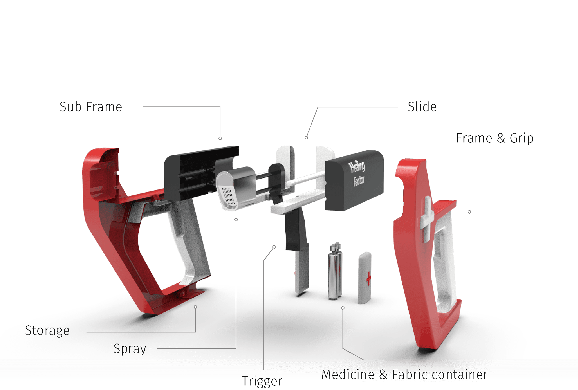 The Healing Gun is a spray-based First-Aid Kit created for rapid injury treatment during outdoor activities. Drawing inspiration from spray-on dressings, it allows users to act quickly, even on sizable wounds. The device sprays disinfectant and medication while forming a delicate Silk membrane over the injury. This membrane effectively seals the wound from external contaminants instantly, reducing the risk of secondary infection and shielding it from further irritation.