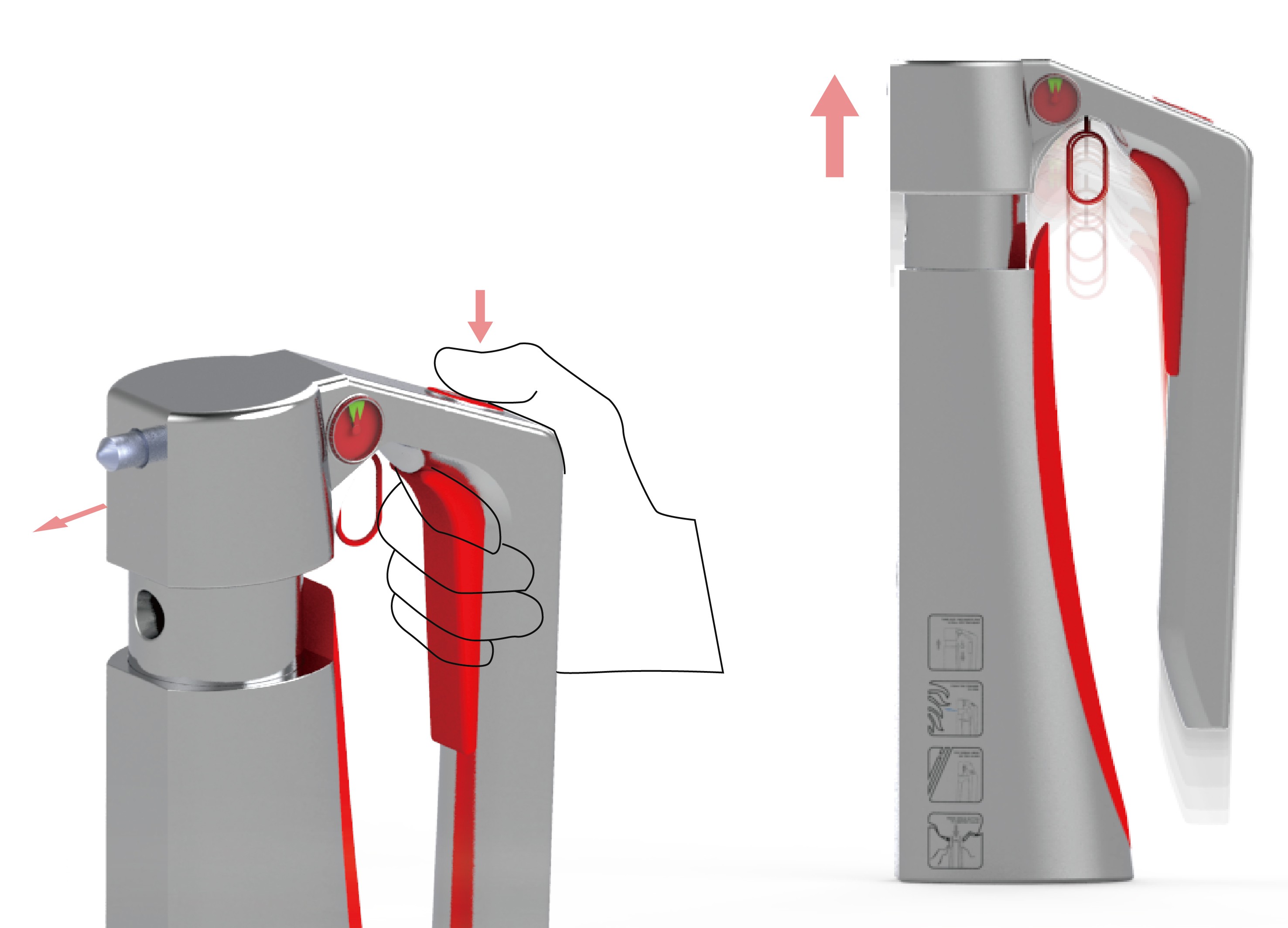 This combination of an 'attachable design' and an 'emergency hammer function' effectively addresses common issues with traditional fire extinguishers: 'the accessibility issue of being hard to find when needed' and 'the limitation of having only a single fire suppression function.' The MFE is a vital safety tool that supports both initial fire suppression and emergency escape.
